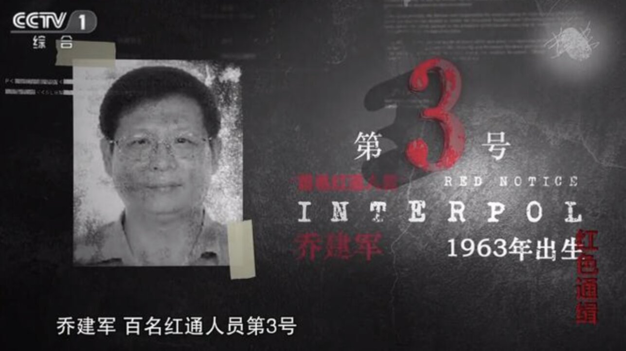 Lệnh truy nã Kiều Kiến Quân của Interpol. Ảnh chụp màn hình chương trình của CCTV