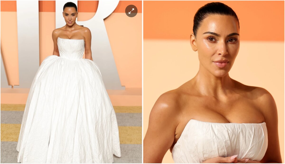 Kim Kardashian cùng chiếc ball gown dáng cúp ngực, phần dưới tạo độ phồng lớn. Thiết kế mang hơi hướm tối giản nhưng vẫn đậm chất cổ điển, lấy cảm hứng từ váy cưới hoàng gia hoặc thời trang haute couture. Theo JustJared, đây là một sáng tạo của Balenciaga, và Kardashian không cần thêm bất kỳ phụ kiện gì vì muốn tôn vinh triệt để vẻ đẹp của bộ cánh.