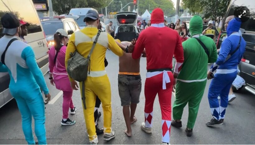 Một đoạn video được chính quyền São Paulo chia sẻ hôm 1/3 cho thấy 4 "siêu nhân" đỏ, xanh, vàng và lục đang khống chế một nghi phạm trộm điện thoại trước sự chứng kiến của đám đông lễ hội, những người không ngừng hô vang: “Power Rangers! Power Rangers!”. Ở một cảnh khác, một Power Ranger áo đen giơ cao một nắm điện thoại thu hồi được từ kẻ gian.