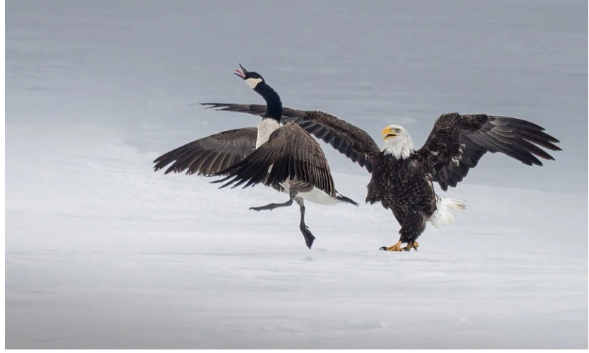 Một cuộc chạm trán hiếm có giữa đại bàng đầu trắng - biểu tượng của nước Mỹ - và ngỗng Canada đã thu hút sự chú ý giữa bối cảnh mối quan hệ hai nước đang căng thẳng.