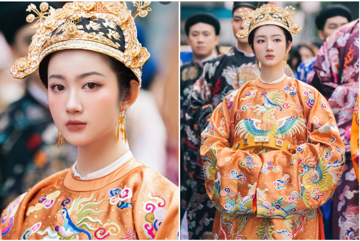 Trang phục và thần thái của Hồng Ân khiến nhiều người xem liên tưởng đến Nam Phương Hoàng hậu - vợ của Vua Bảo Đại, cũng là hoàng hậu cuối cùng trong triều đại phong kiến Việt Nam. Sau sự kiện, người mẫu Gen Z nhận về nhiều lời khen "có cánh" từ dân mạng. "Khi mọi người khen, mình vui nhưng cũng ngại lắm vì vẫn còn những thiếu sót. Được ban tổ chức giao cho bộ trang phục Nam Phương Hoàng hậu, mang nhiều ý nghĩa lịch sử, mình rất tự hào", cô chia sẻ. Ảnh: Phó Lâm Việt Trung.