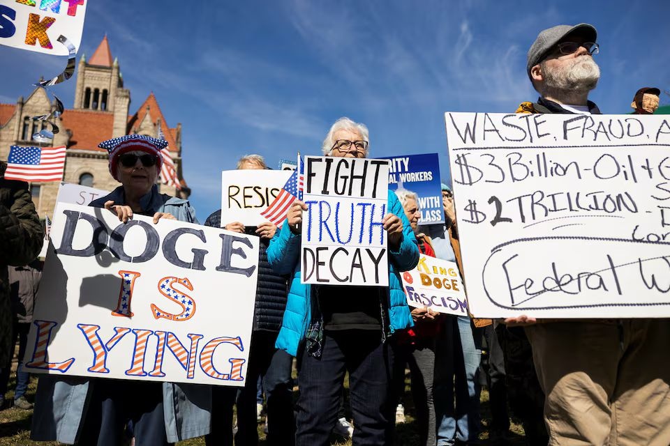 Nhóm người biểu tình tại cuộc tuần hành ủng hộ công chức liên bang ở trung tâm thành phố Parkersburg, West Virginia, Mỹ vào ngày 28/2. Ảnh: Reuters.