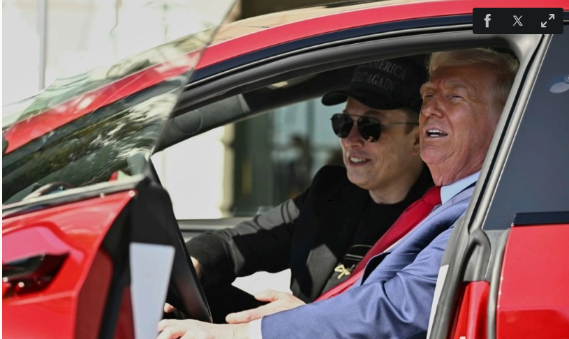 Tổng thống Donald Trump và giám đốc điều hành Tesla Elon Musk ngồi trong chiếc xe Tesla Model S màu đỏ tại Bãi cỏ phía Nam Nhà Trắng hôm 11/3. Ảnh: AP