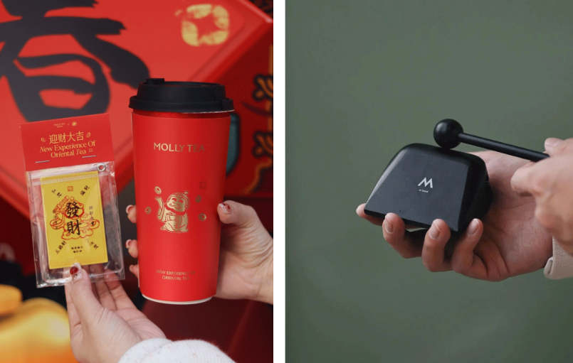 Bên trái: Sản phẩm giao thoa thương hiệu của Molly Tea và Đền Lingshun; bên phải: “muyu” hay cá gỗ của M Stand, theo truyền thống được sử dụng trong khi tụng kinh Phật. WeChat.