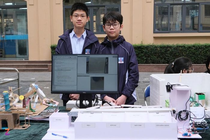 Sáng 19/3, tại Ngày hội STEAM 2025 của trường Nguyễn Siêu (quận Cầu Giấy, Hà Nội), bàn trưng bày sản phẩm của Nguyễn Thành Vinh và Trần Khải Tuấn (cùng là học sinh lớp 8IG1S0, trường Nguyên Siêu) đông nghịt bạn học.