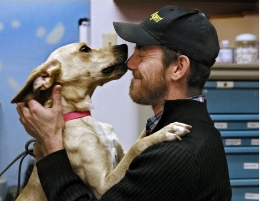Steffen Baldwin ôm một chú chó tại Hiệp hội Bảo vệ Động vật hạt Union, bang Ohio, vào tháng 11/2013. Ảnh: Columbus Dispatch