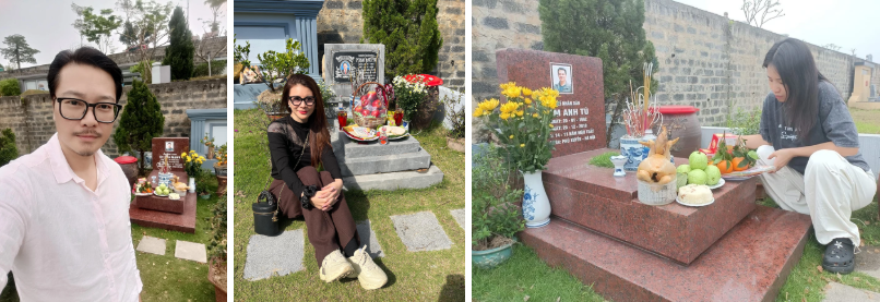 Nghệ sĩ Nhân dân Tạ Tuấn Minh, Nghệ sĩ Ưu tú Kim Oanh, Nghệ sĩ Ưu tú Khuất Quỳnh Hoa thỉnh thoảng vẫn đến thăm phần mộ của Nghệ sĩ Nhân dân Anh Tú. Ảnh: FBNV