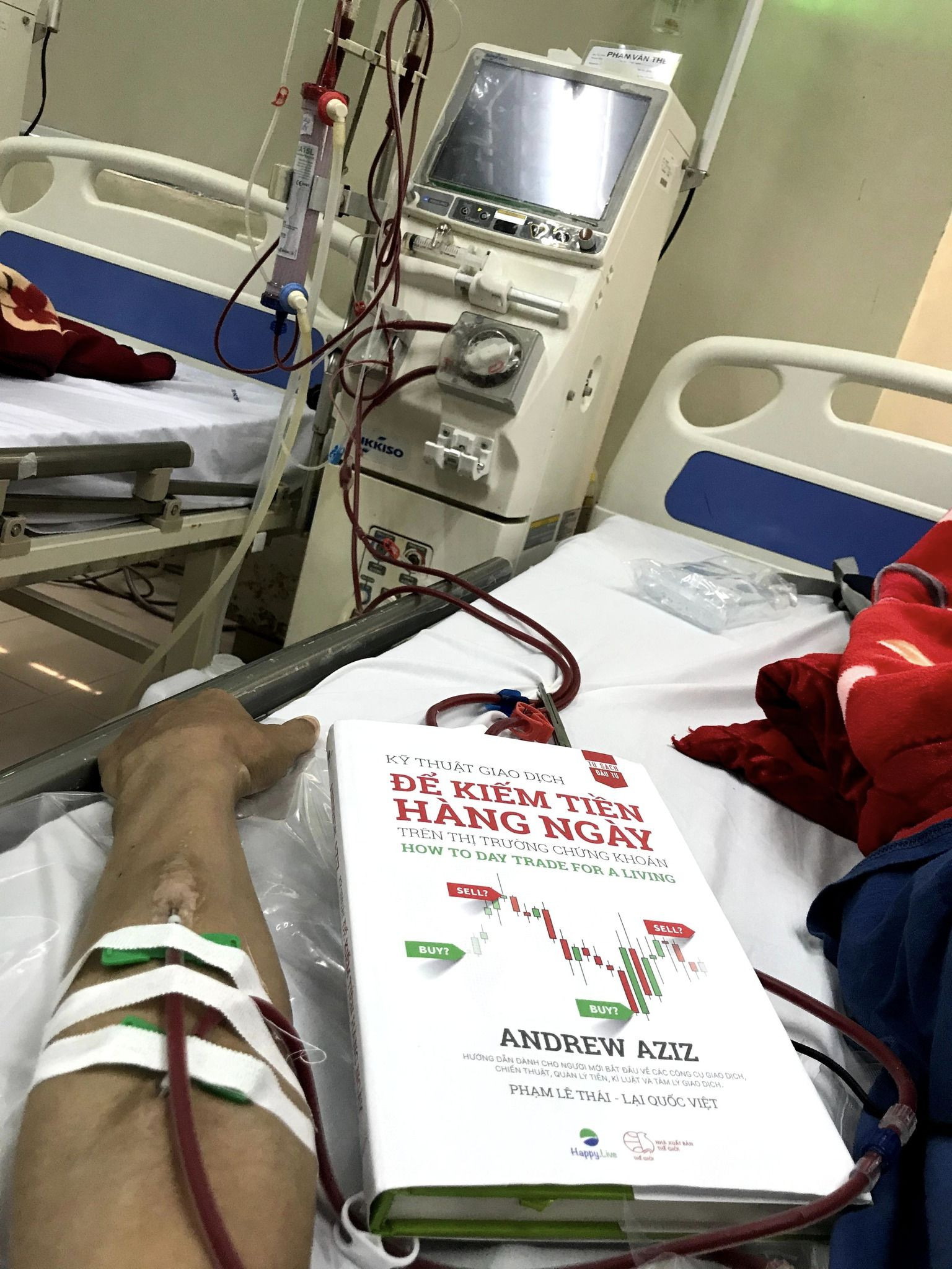 Lúc chạy thận, anh Thế tranh thủ đọc các cuốn sách về kinh doanh. Ảnh: NVCC.