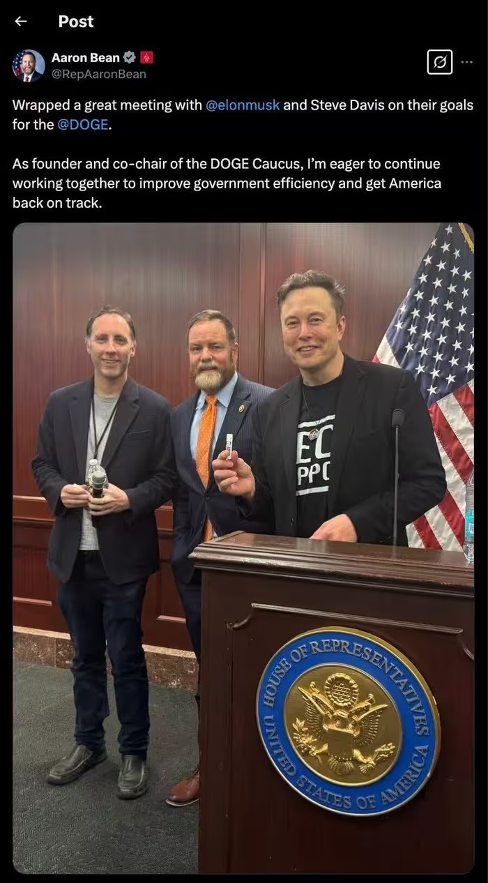 Hạ nghị sĩ Aaron Bean, một thành viên Đảng Cộng hòa, đã đăng bức ảnh chụp cùng Musk và Davis với dòng chú thích: “Vừa có một cuộc họp tuyệt vời với @elonmusk và Steve Davis về mục tiêu của @dogE". Ảnh: X.
