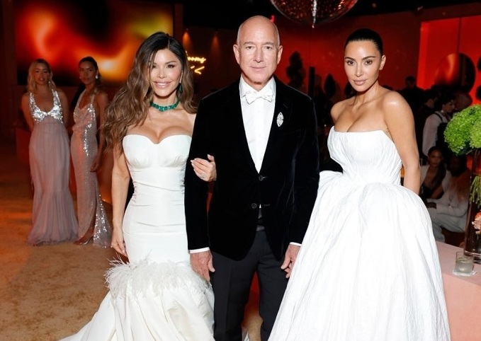 Tỷ phú Jeff Bezos, 61 tuổi, và vợ sắp cưới, 56 tuổi, chụp hình cùng ngôi sao truyền hình Kim Kardashian (phải) tại tiệc hậu Oscar do tạp chí Vanity Fair tổ chức tháng 3. Ảnh: WireImage