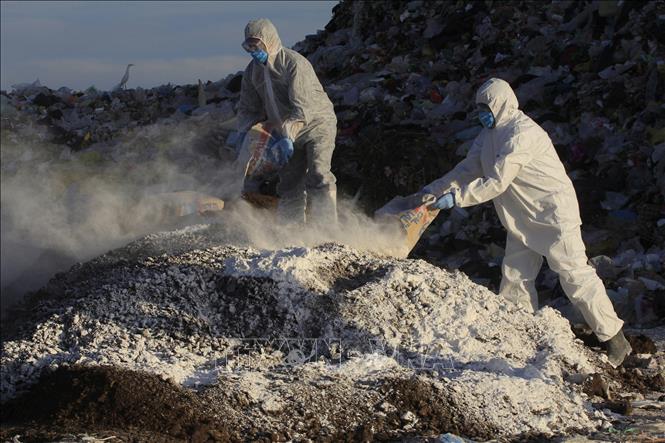 Nhân viên y tế phun hoá chất khử trùng tại bãi chứa chất thải gia cầm nhằm ngăn dịch cúm gia cầm lây lan ở Dolores Hidalgo, bang Guanajuato, Mexico. Ảnh tư liệu: Getty Images