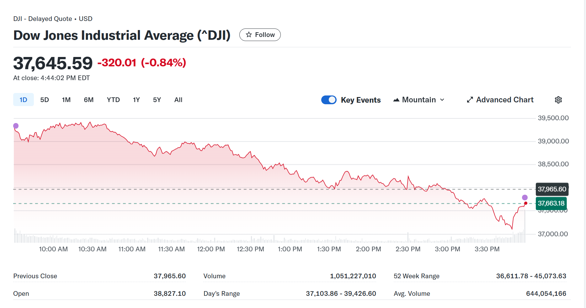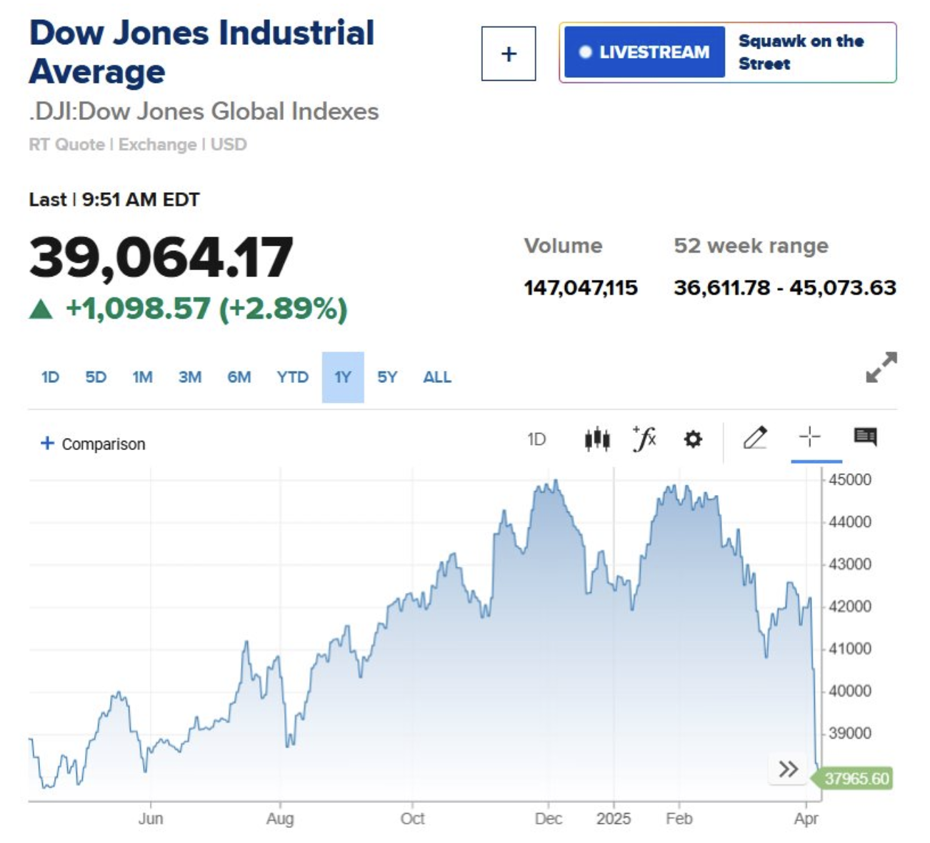 Chỉ số Dow Jones gồm 30 cổ phiếu có thời điểm đã giảm hơn 1.700 điểm trong phiên giao dịch. Biên độ dao động trong ngày lên tới 2.595 điểm. Kết phiên, chỉ số này giảm 349 điểm, tương đương 0,9%.