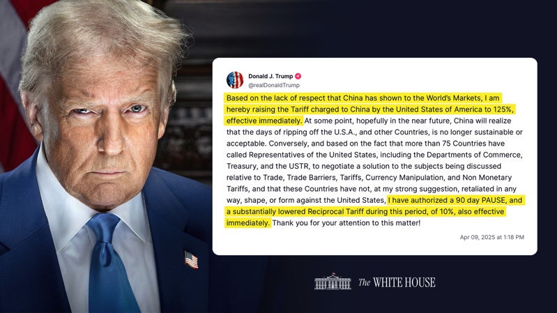 Tổng thống Mỹ Donald Trump đăng trên Truth Social tuyên bố tăng thuế ngay lập tức với Trung Quốc lên 125% và hoăn áp thuế 90 ngày với hơn 75 nước, cũng như hạ thuế đối ứng xuống 10%.