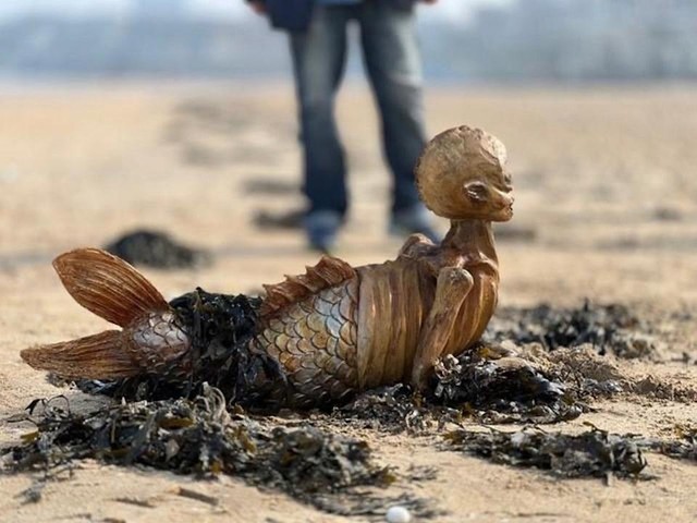 Những bức ảnh về sinh vật trôi dạt bí ẩn, một phần bị chôn vùi trong cát và được bao phủ bởi rong biển, cho thấy nó có một cái đầu hốc hác, giống người ngoài hành tinh, thân hình gầy gò và đuôi có vảy như một nàng tiên cá rùng rợn.