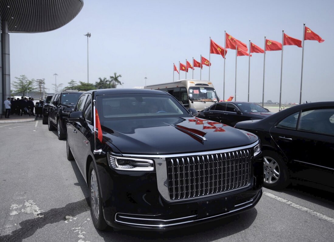 Chiếc xe Limousine Hồng Kỳ N701 được sử dụng để chở Tổng Bí thư, Chủ tịch Trung Quốc Tập Cận B́nh đă đến nhà khách VIP A, sân bay Quốc tế Nội Bài, trưa 14/4. Ảnh: HH