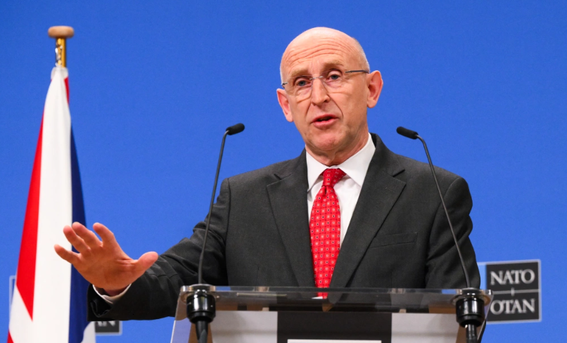 Bộ trưởng John Healey tại cuộc họp báo sau hội nghị của UDCG ở Bỉ hôm 11/4. Ảnh: AFP