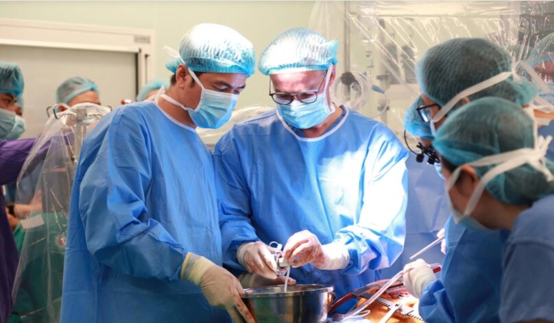 Các bác sĩ, chuyên gia ghép tim nhân tạo cho bệnh nhân. Ảnh: Bệnh viện cung cấp