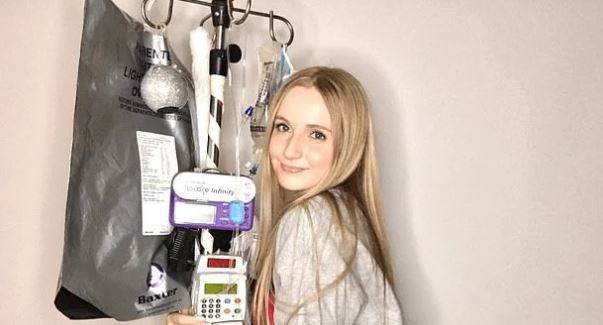 Để giữ mạng sống cho cô, các bác sĩ đã phải đặt một ống truyền vào tĩnh mạch gần tim để cung cấp chất dinh dưỡng và nước qua túi truyền tĩnh mạch (IV). Hệ thống này, được gọi là "Total Parenteral Nutrition (TPN) (tạm dịch: Dinh dưỡng qua đường tĩnh mạch hoàn toàn)", đã trở thành nguồn thực phẩm duy nhất của cô từ năm 14 tuổi.