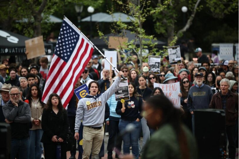 Trong khuôn viên Đại học Berkeley ở Berkeley, California, hàng trăm sinh viên, giảng viên và thành viên cộng đồng tập hợp, vẫy cờ Mỹ và mang theo các biểu ngữ như "Giáo dục mang lại lợi ích cho cộng đồng" và "Đừng động vào quyền tự do ngôn luận của chúng tôi".