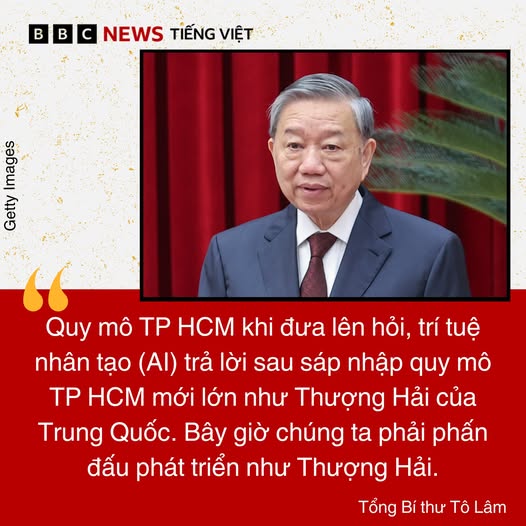 Ông Tô Lâm nói ông đã hỏi trí tuệ nhân tạo (AI) và nhận được câu trả lời rằng “sau sáp nhập quy mô TP HCM mới lớn như Thượng Hải của Trung Quốc”.