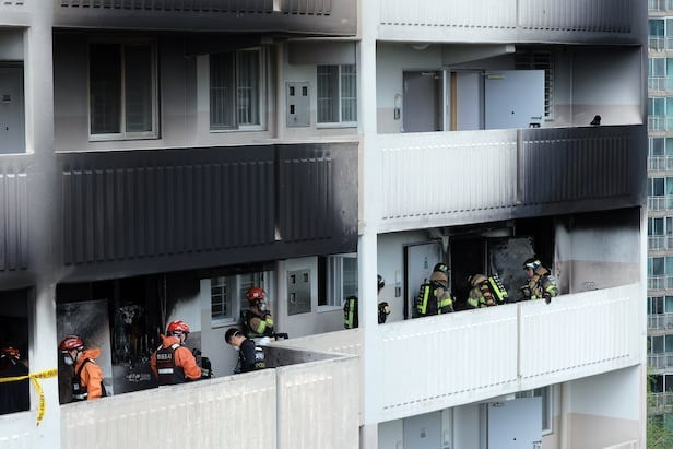 Lính cứu hỏa kiểm tra căn hộ bị cháy đen tại quận Gwanak, phía nam Seoul. (Ảnh: Yonhap)