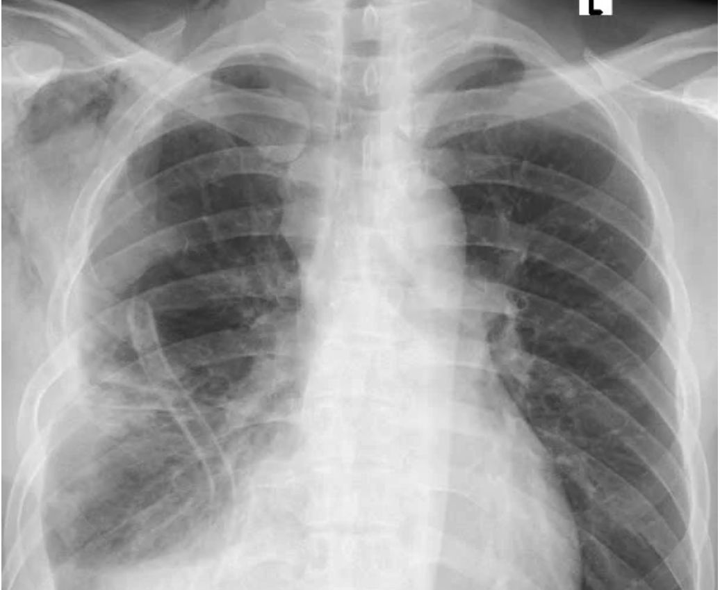 Qua thăm khám và chụp cắt lớp vi tính lồng ngực, các bác sĩ phát hiện khối u trung thất khổng lồ nằm lệch trong khoang màng phổi phải, chèn ép gây xẹp gần như toàn bộ phổi phải, đẩy lệch cơ hoành.