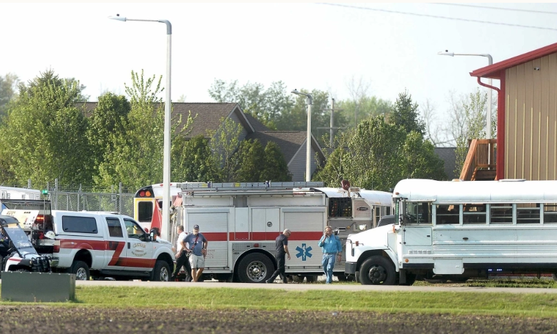 Xe cứu thương, cảnh sát bên ngoài khu trại hè học sinh ở làng Chatham sau vụ lao xe ngày 28/4. Ảnh: Reuters