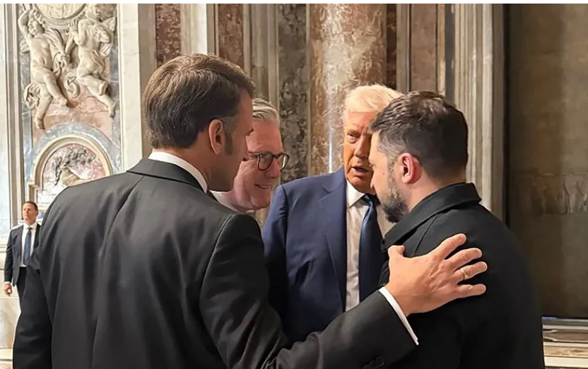 Tổng thống Volodymyr Zelensky gặp Tổng thống Pháp Emmanuel Macron, Thủ tướng Anh Keir Starmer và Tổng thống Mỹ Donald Trump trong lễ tang của Giáo hoàng Francis vào ngày 26/4/2025 tại Vatican. Ảnh Getty Images