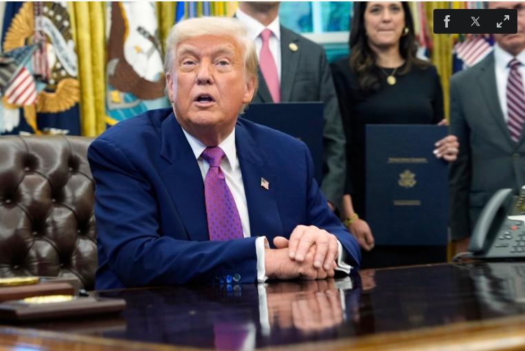 Ông Trump trả lời phóng viên khi ký sắc lệnh tại phòng Bầu dục ở Nhà Trắng ngày 9/5. Ảnh: AP
