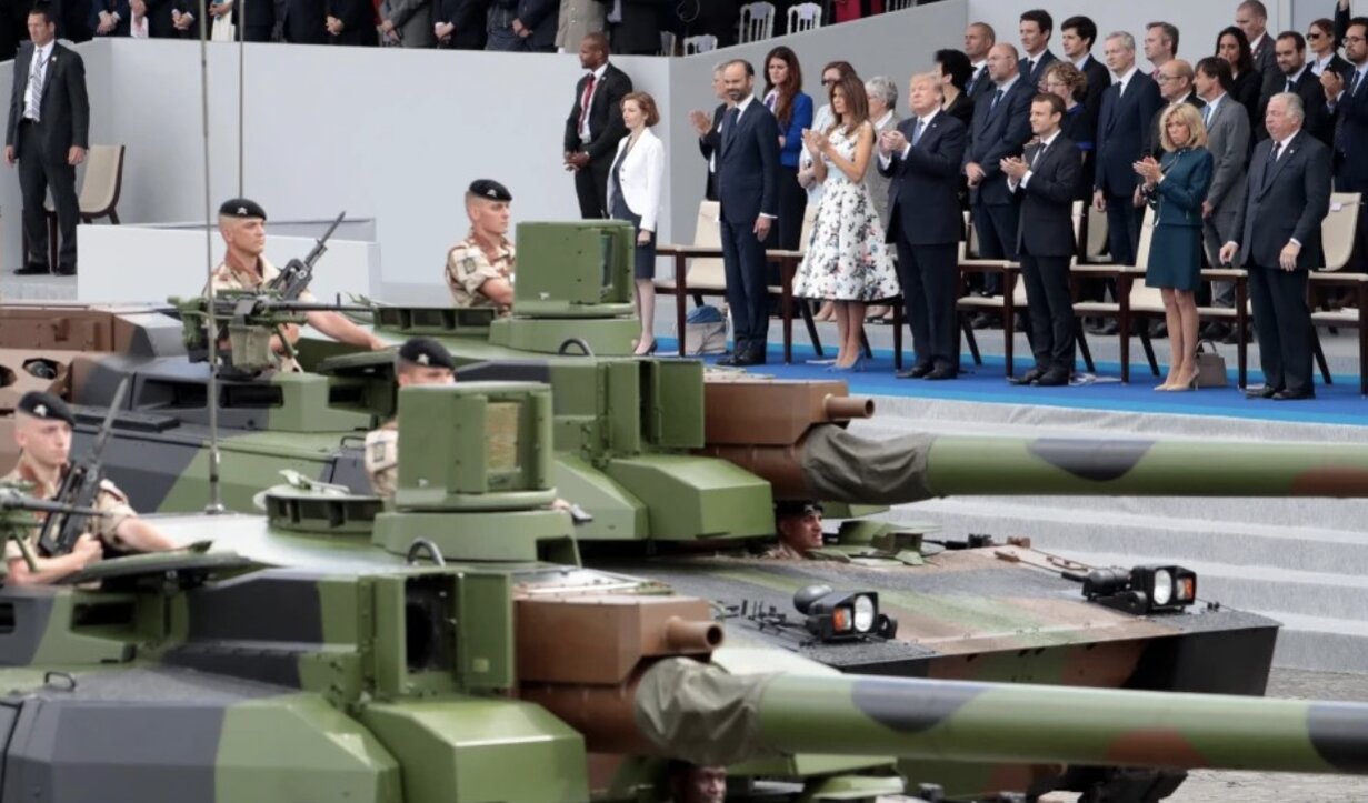Tổng thống Mỹ Donald Trump và người đồng cấp Pháp Emmanuel Macron chứng kiến cuộc diễu binh thường niên Ngày Bastille của Pháp trên đại lộ Champs-Elysees ở Paris vào ngày 14/7/2017. Sự kiện này đã truyền cảm hứng cho ông Trump cân nhắc tổ chức một cuộc diễu binh tương tự tại Mỹ.