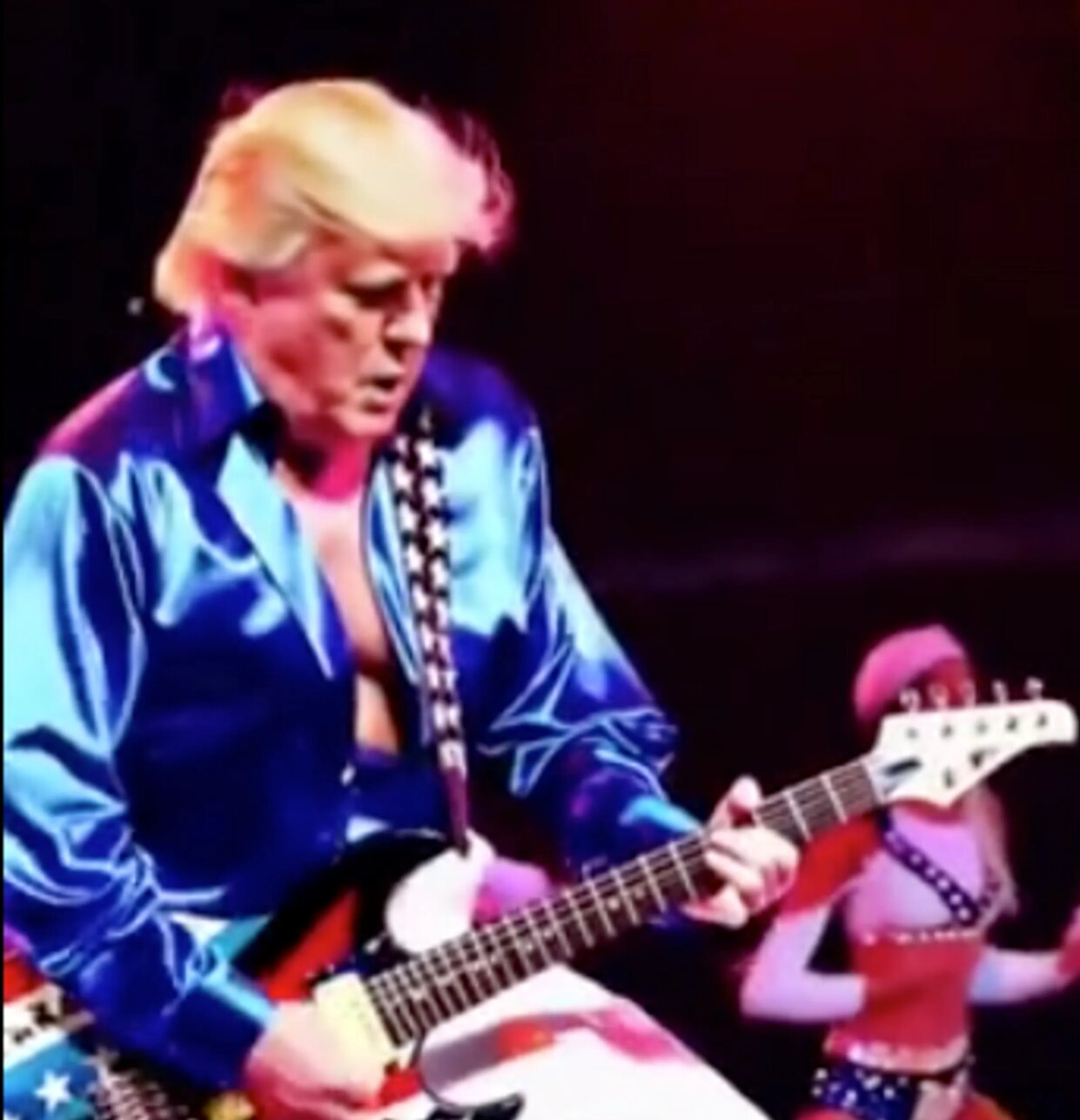 Sau đó, Trump thay từ bộ vest sang bộ trang phục màu đỏ, trắng và xanh và được nhìn thấy đang chơi một đoạn riff guitar trước khi chuyển sang bộ trống.