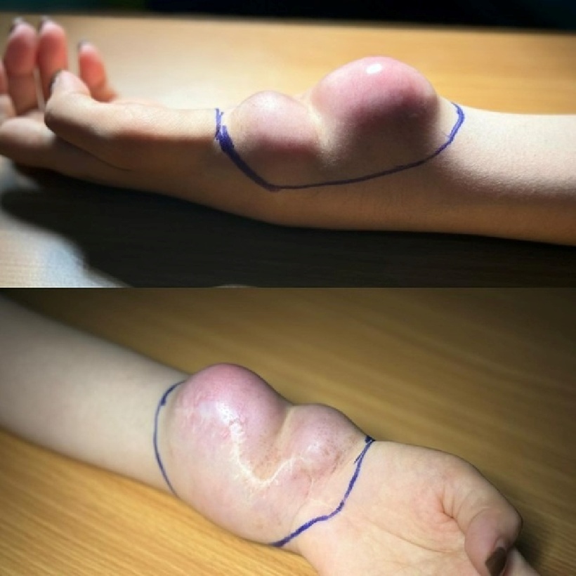Việc lấy khối u cũng chưa triệt để, dẫn đến tháng 10/2024, chúng tái phát nhanh, lan rộng toàn bộ cổ tay phải, gây đau nhức, sưng to và hạn chế vận động nghiêm trọng. Khi nhập Bệnh viện Bệnh Nhiệt đới Trung ương, khối u đã lan khắp mặt trước cổ tay, hai bên và sát khuỷu tay, kích thước lên tới 13x8x7 cm.