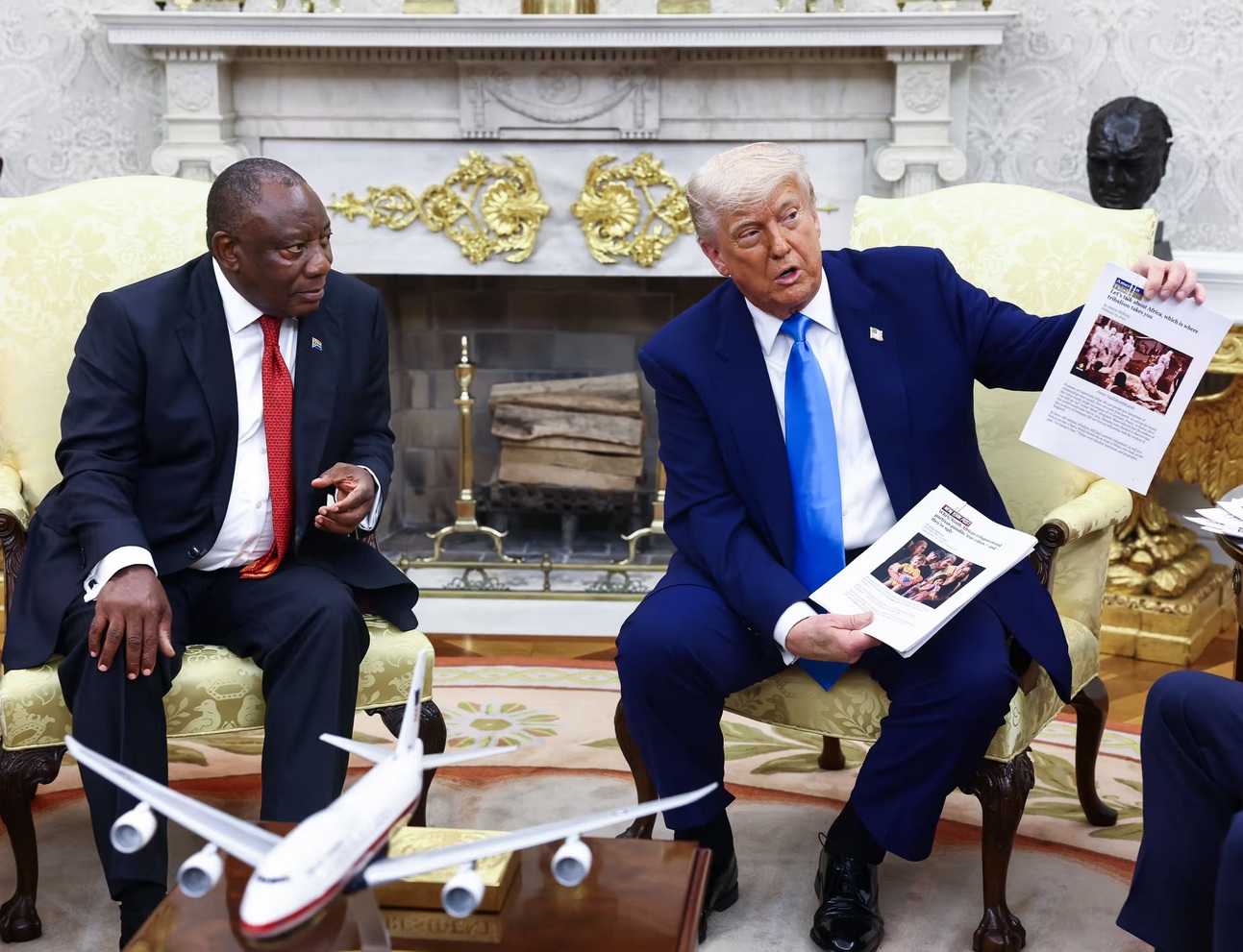 Tờ Guardian (Anh) cho biết, trong cuộc hội đàm, nhà lãnh đạo Mỹ đã giơ bản in của một bài báo kèm theo bức ảnh và nhận xét: “Tất cả họ đều là người nông dân da trắng đang bị chôn vùi”.