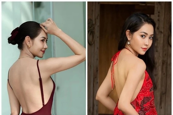 Tường Vi sở hữu võng lưng đẹp “mướt mắt”. Để khoe lợi thế hình thể này, cô chuộng trang phục cổ yếm hoặc hai dây. Ảnh: FB Tường Vi.