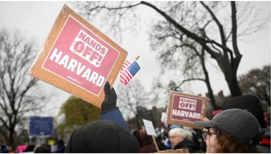 Những người biểu t́nh tập trung tại Cambridge Common kêu gọi ban lănh đạo Harvard phản đối sự can thiệp của chính quyền liên bang vào trường đại học. Ảnh: Reuters.