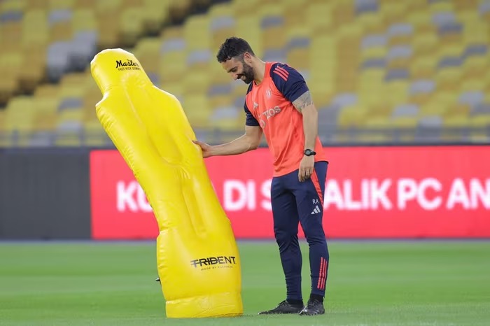 Vị thuyền trưởng của MU cẩn thận chỉnh lại thiết bị hỗ trợ tập luyện tại sân Bukit Jalil.