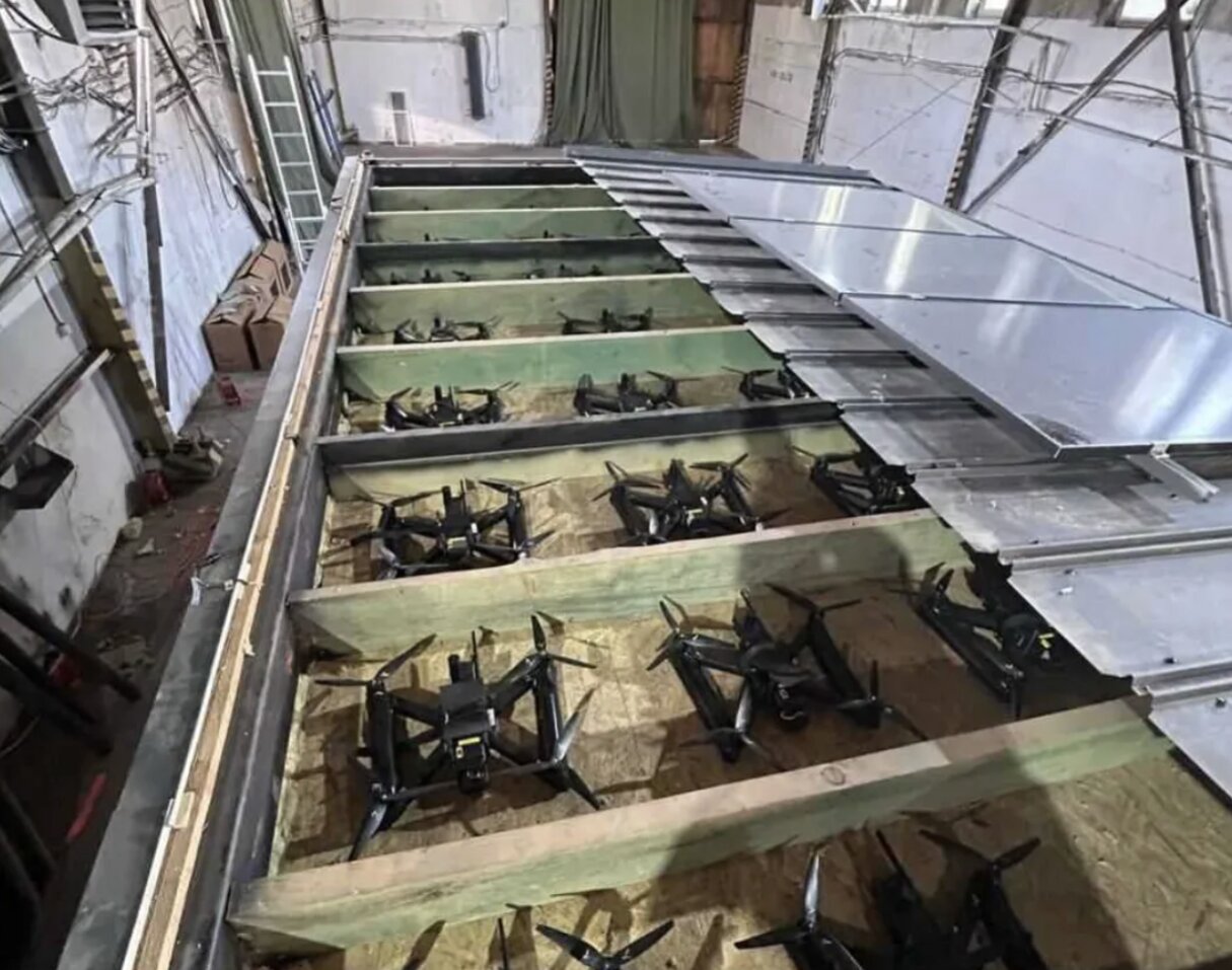 Hình ảnh cho thấy các thiết bị bay không người lái góc nhìn thứ nhất được sử dụng trong cuộc tấn công sân bay của Liên bang Nga, được đặt trong mái của các “căn nhà gỗ di động”, sau đó được vận chuyển bằng xe tải và được phóng đi từ đó. Nguồn: Cơ quan An ninh Ukraine - SBU.