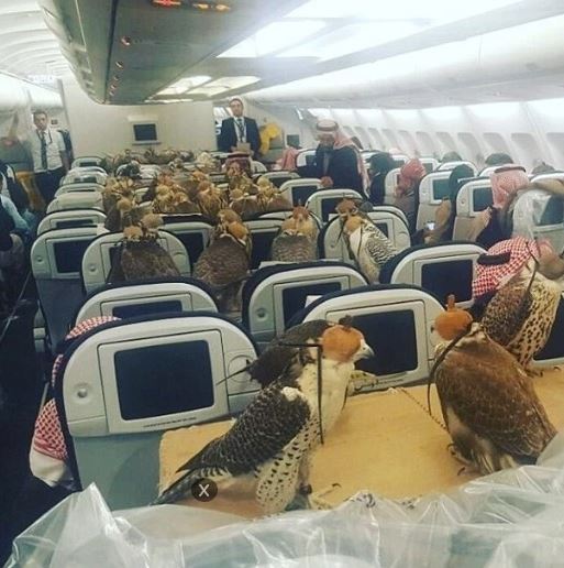 Dư luận từng xôn xao trước một bức ảnh ghi lại cảnh 80 con chim ưng đứng kín cabin trên máy bay. Trên chuyến bay thương mại Boeing 767, hăng hàng không trong bức h́nh được xác định là Quatar Airways. Theo đó, vị khách VIP là một hoàng tử Saudi sẵn ḷng chi số tiền không nhỏ để chi trả 80 vé máy bay cho 80 con chim ưng quư trong khoang hạng nhất. Những con chim được cột vào ghế, tránh t́nh trạng gây hỗn loạn trên chuyến bay. Dù việc vận chuyển chim ưng không c̣n là điều hiếm gặp nhưng lần vận chuyển số lượng lớn lên tới 80 con như trên là điều hi hữu.