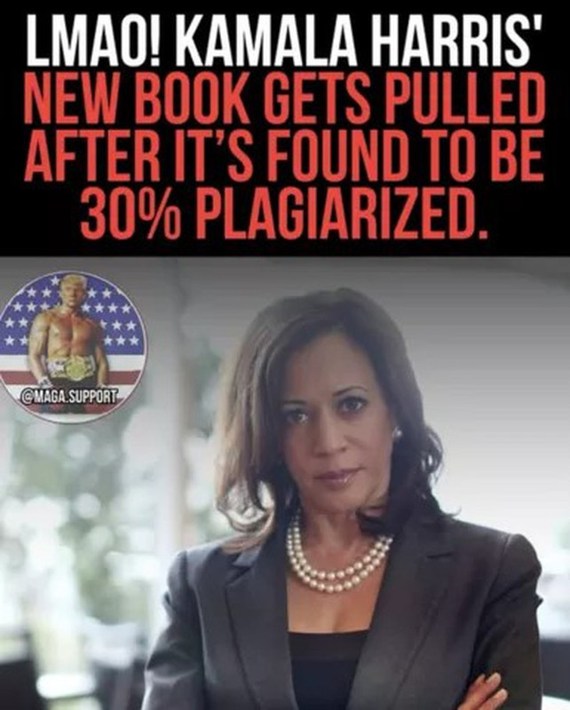 Nội dung ghi: "Cười không nhặt được mồm! Cuốn sách mới của Kamala Harris bị gỡ khỏi kệ sau khi phát hiện 30% nội dung là đạo văn".