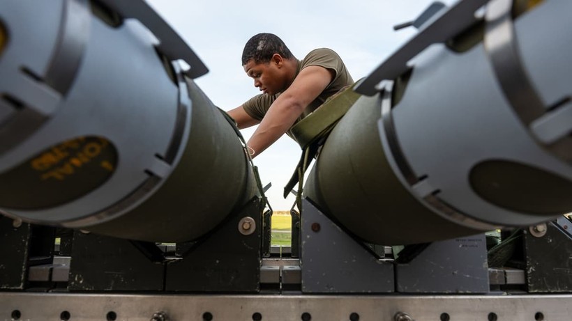 Một phi công đang chuẩn bị bom GBU-38 để lắp vào máy bay ném bom tàng hình B-2 Spirit. Ảnh: Không quân Mỹ.