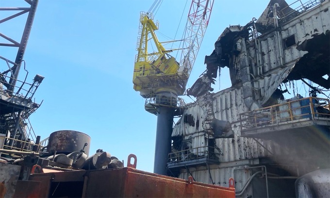 Giàn khoan Tavrida sau khi trúng tên lửa Nga ngày 9/6. Ảnh: GUR