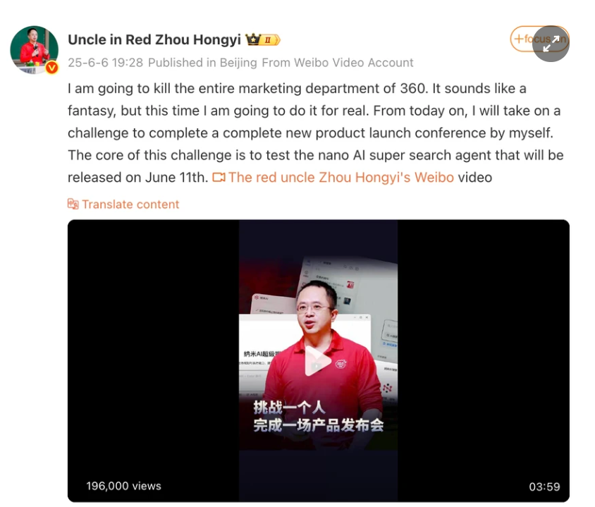 Video của CEO 360 Securiy Technology nói sẽ sa thải toàn bộ nhân sự marketing thu hút sự chú ý trên mạng xã hội Weibo. Ảnh: Weibo.