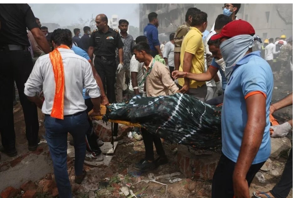 Thi thể nạn nhân được đưa ra khỏi hiện trường vụ tai nạn sau khi máy bay Boeing 787 Dreamliner của Air India bị rơi ở Ahmedabad, Ấn Độ. Ảnh: Reuters