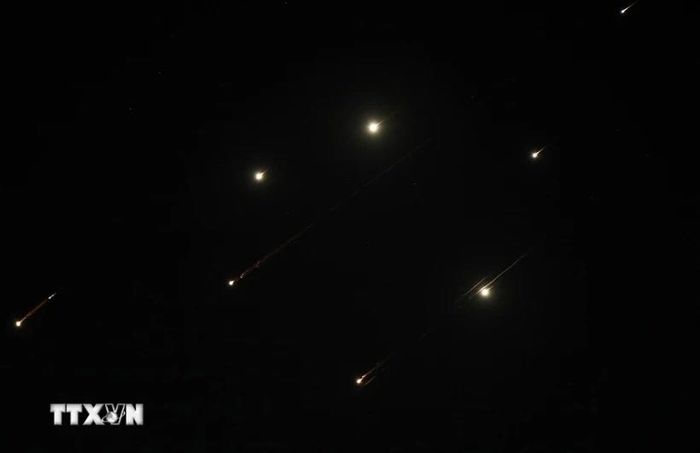 Các vệt sáng trên bầu trời thành phố Nablus, Bờ Tây khi Iran phóng tên lửa vào lãnh thổ Israel tối 14/6/2025. (Ảnh: THX/TTXVN)