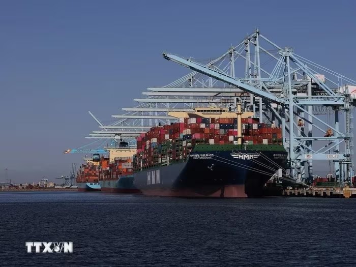 Tàu chở hàng hóa neo tại cảng Los Angeles, California (Mỹ). (Ảnh: THX/TTXVN)