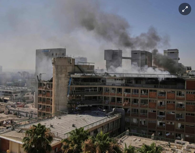 Khói bốc lên từ bệnh viện Soroka, Israel sau khi bệnh viện trúng tên lửa từ Iran. Ảnh: Reuters.