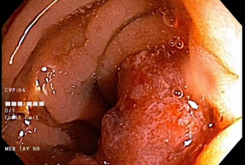 - K đại tràng sigma: Nội soi đại tràng tại đại tràng sigma có tổn thương sùi nham nhở, mủn nát, chạm vào dễ chảy máu, kích thước khoảng 4-5cm, chiếm khoảng 1/3 chu vi đại tràng. Ngay trong quá trình nội soi phát hiện bất thường, các bác sĩ tiến hành lấy sinh thiết 4 mảnh làm mô bệnh học. Kết quả giải phẫu bệnh: Carcinoma tuyến biệt hóa vừa nên chuẩn đoán ung thư đại tràng.