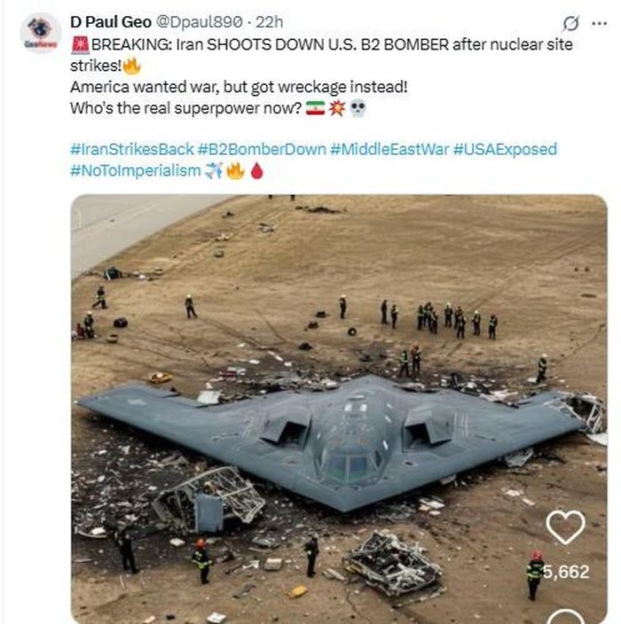 Hình ảnh xác một máy bay ném bom B-2 của Mỹ bị bắn hạ và hư hại nghiêm trọng đã khiến cộng đồng mạng xôn xao trong bối cảnh Mỹ tham gia xung đột Iran - Israel.