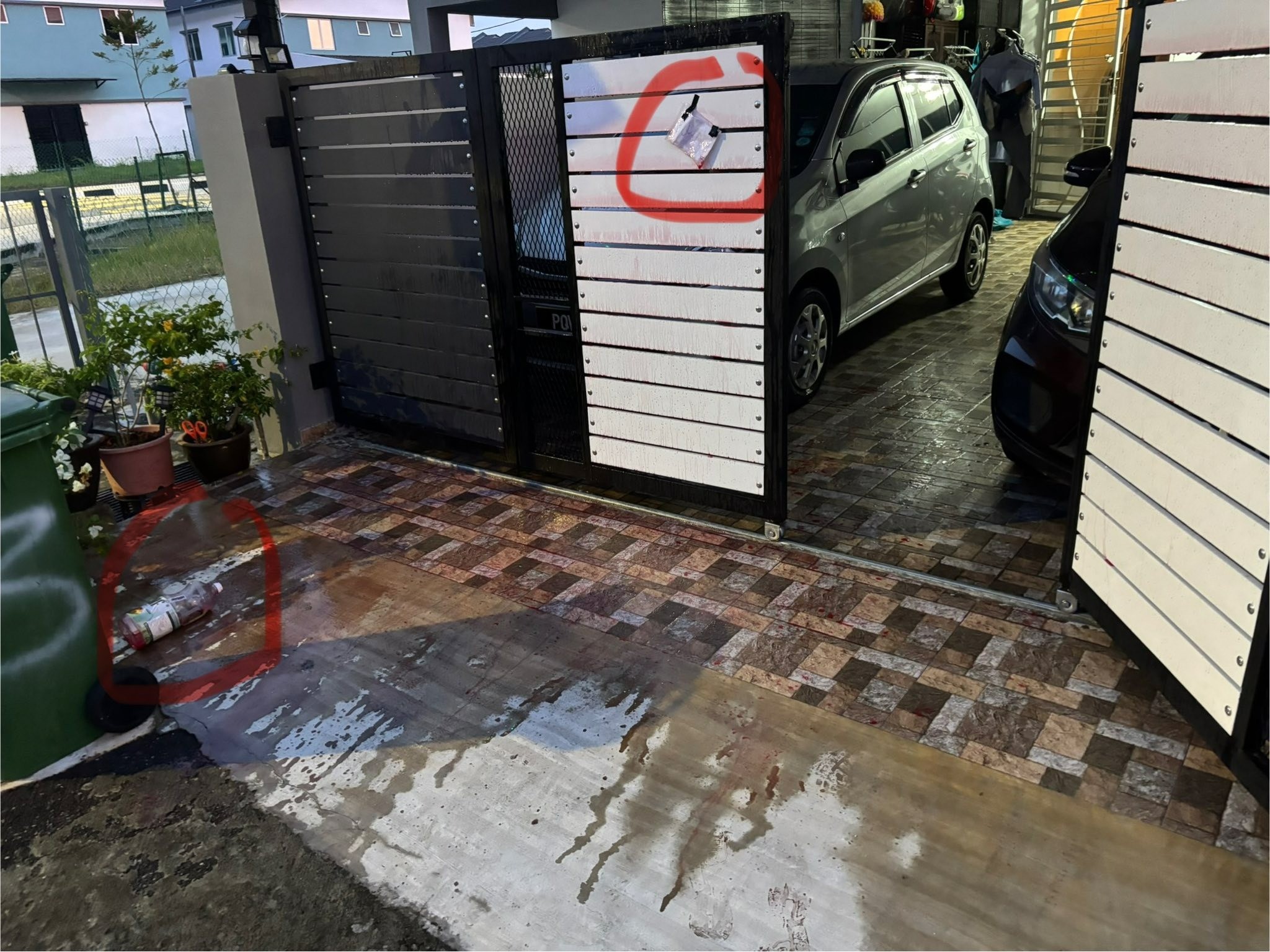 Anh Mohamad Asrul, một trong các nạn nhân, chia sẻ trải nghiệm kinh hoàng lên Facebook vào ngày 25/6. Theo đó, vào ngày 16/6, anh phát hiện có dấu vết xăng, sơn và một mảnh giấy ghi tay dán ngay cổng nhà anh và hàng xóm.