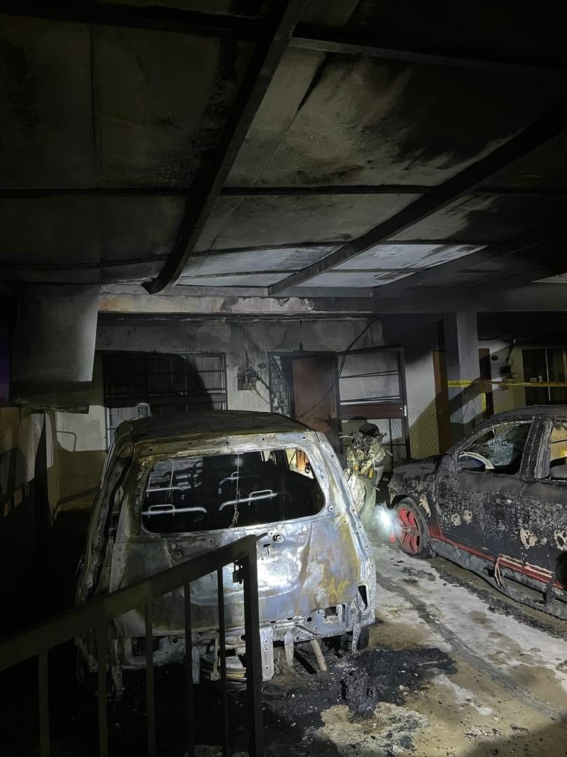 Năm chiếc ô tô và bốn xe máy bị cháy trơ khung. Ảnh: Facebook